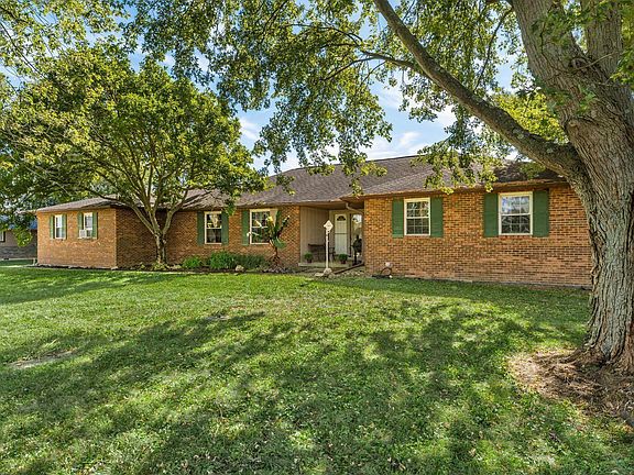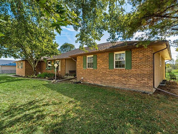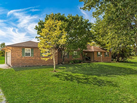 This low-maintenance brick and stucco ranch offers over 1,800 square feet and sits on a beautiful one-acre lot surrounded by peaceful countryside. A covered front porch welcomes you through French doors into this spacious home. The large kitchen provides plenty of room for a table, plus there's a separate dining area for larger gatherings. The family room features a cozy wood-burning fireplace with a brick hearth and mantel, along with a sliding door leading to the backyard.