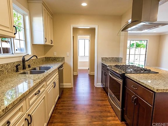 Fantastic "Duplex Style" single family residence... This complete remodel is perfect for the large family and / or a rental investment! TWO separate vehicle entrances and covered parking for multiple cars are just one of many great features. The main house features 3 remodeled bedrooms and bathrooms, wood floors, new designer paint, and LED efficient lighting. The main house kitchen features new cabinetry w/ "soft close" doors and drawers, granite counters, and high end stainless steel appliances. The "guest quarters" features a full kitchen with new cabinetry, new appliances and more granite counters, along with a fireplace, a large living area with a remodeled bathroom, and more LED efficient lighting. The backyard is open, with a grass area, driveway and more covered parking. This unique home really is a MUST SEE!
