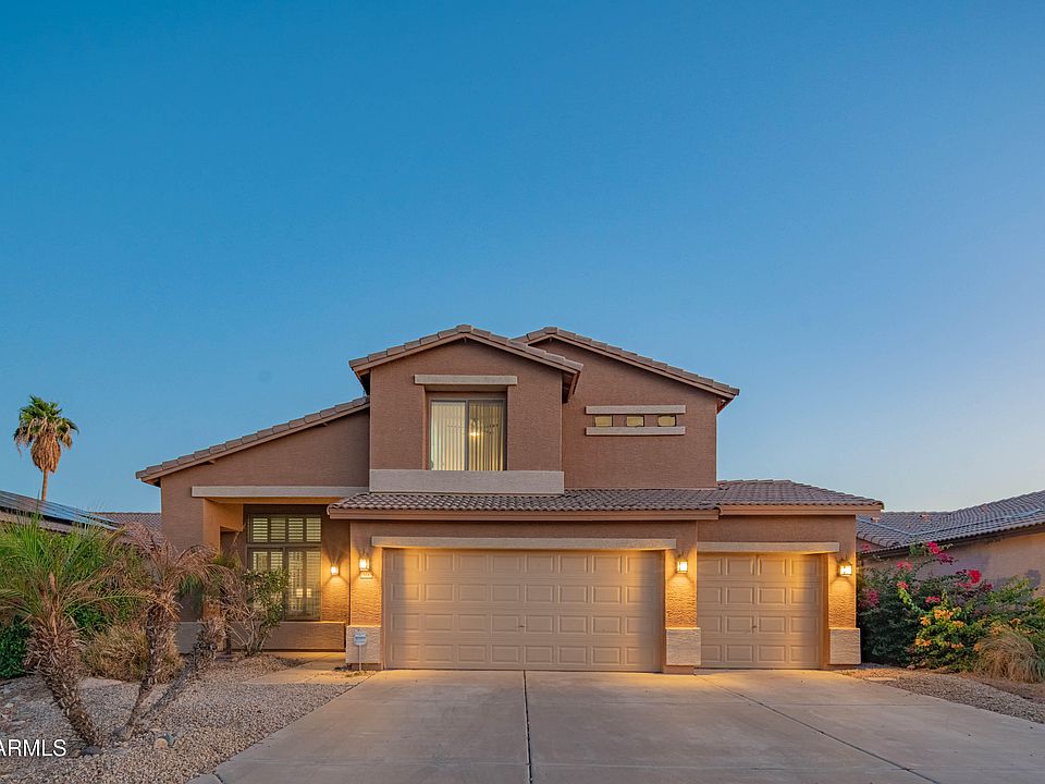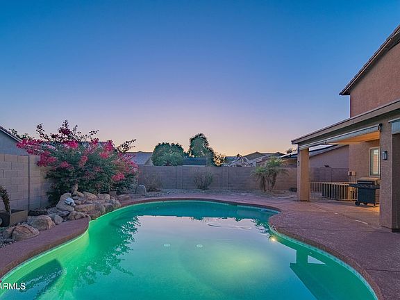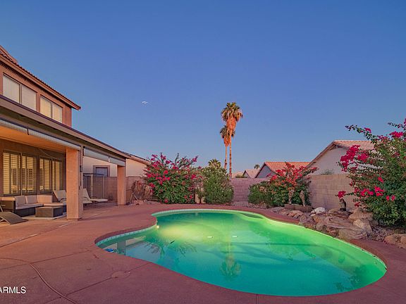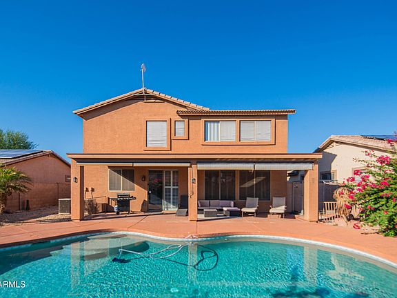 YOUR OWN ARIZONA RETREAT! FULLY FURNISHED!. This immaculate, turn-key 3-bedroom, 2.5-bath home offers style & comfort inside and out. Enjoy your SPARKLING POOL, covered patio, and lushly landscaped backyard— a private oasis! The open kitchen and family room are perfect for entertaining, complemented by formal living & dining areas with fireplace. Upstairs features a spacious primary suite, two guest bedrooms, full bath, and a versatile loft - ideal for work or play. Highlights include: vaulted ceilings, upgraded fixtures, ceiling fans and lighting! NEW hot water tank, water filtration system, water softener, fresh neutral décor, and 3-car garage with ample storage. Conveniently situated near schools, shopping, recreation, spring training, and more. This is Arizona Living!