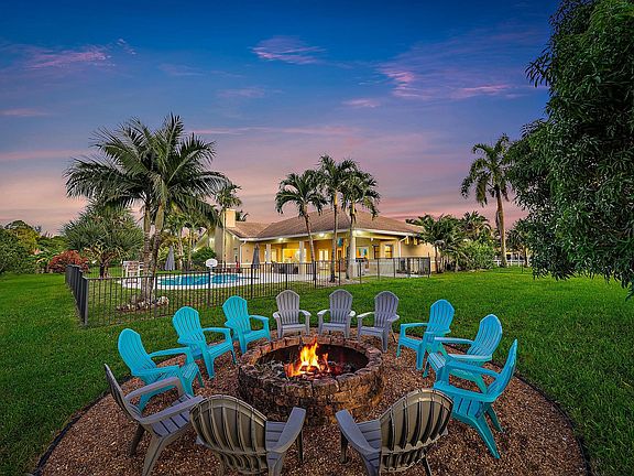 Outside, the backyard feels like a private oasis, complete with a sprawling covered lanai with a wet bar overlooking the sparkling pool. The fenced backyard provides an ideal play area for kids or pets, while a cozy fire pit area creates the perfect spot for relaxing under the stars. A mature mango tree adds to the tropical charm, and the property benefits from canal-fed irrigation for the sprinkler system.