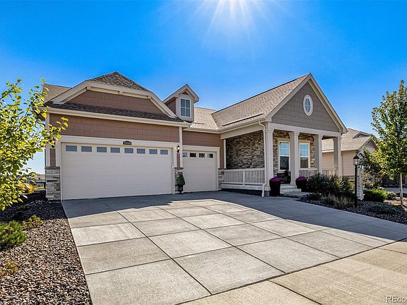 RARE GOLF COURSE LOT WITH THE REDFORD 4BD 3 BATH HOME!!! Welcome to this exquisite residence located in the highly sought-after 55+ community of Heritage Todd Creek! The 3-car garage immediately sets the tone. Inside, you’ll be greeted by an inviting living room featuring a cozy fireplace that creates the perfect gathering spot. Wood-look floors add warmth and elegance, while the open concept design and high ceilings makes entertaining effortless. Host holiday dinners in the dining area, perfectly situated for both intimate evenings and lively celebrations. Kitchen is a true showstopper boasting sleek solid surface counters, stainless steel appliances, convenient wall ovens, and a striking mosaic tile backsplash that adds a touch of artistry. The center island with breakfast bar provides additional space for meal prep or morning coffee. Whether you love to cook or just enjoy a beautiful kitchen, this one delivers on both function and style. At the end of the day, retreat to the main bedroom, your personal sanctuary. Featuring wood-look floors, a charming bay window, and a private spa-like bathroom, this space offers the ultimate in relaxation. The bathroom is thoughtfully designed with double sinks, a glass-enclosed shower, and tile floors, complemented by a generous walk-in closet to keep everything organized leading directly into your laundry room complete with a sink and plenty of cabinets for storage. For those who work from home, need a reading nook, or want a quiet creative corner, the bedroom provides the flexibility to make it your own. Outdoors, enjoy Colorado’s stunning sunsets from the covered patio backing to the amazing golf course and sitting area, the perfect setting for your favorite beverage or quiet reflection. This community enhances your lifestyle with amenities including a resort-style pool, fitness center, clubhouse, and more, all designed to encourage relaxation and connection.