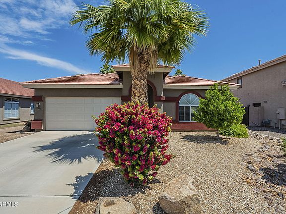 This lovingly maintained 3 bedroom, 2 bathroom home features a desirable split floor plan, offering both privacy and functionality. The updated kitchen comes with ample storage and seamlessly connects the two distinct living areas - perfect for both entertaining and everyday living. The front living space features newer carpet and a ton of natural light, while the rear family room offers a more secluded retreat, overlooking a lush backyard adorned with mature landscaping, low maintenance turf, sparkling pool and covered patio ideal for Arizona evenings. A versatile den at the front of the home provides the perfect space for a home office, playroom , or potential fourth bedroom, adding flexibility to suit your lifestyle. Enjoy the convenience of nearby parks, schools, dining, shopping and medical centers with easy access to Loop 303. Come see this home today!