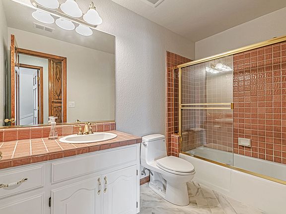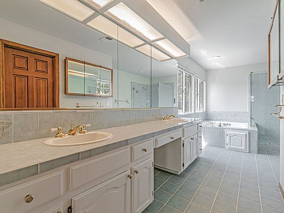Master bath includes a double vanity, walk-in shower and oversized jacuzzi bathtub.