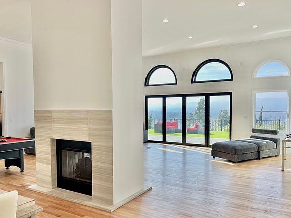Perched on a private promontory just off Mulholland Drive, this gated Modern Farmhouse-style estate sits on over an acre of manicured grounds, offering sweeping jetliner views of the city and valley. Nestled in a quiet cul-de-sac near Bel Air Crest, the five-bedroom, five-bath residence delivers rare privacy, refined interiors, and resort-style amenities. The home welcomes with a grand limestone fireplace, soaring ceilings, and expansive bi-fold doors that frame the breathtaking scenery. A fully renovated kitchen features Thermador appliances, a pizza oven, and a large eat-in area overlooking the views. The spacious primary suite includes dual walk-in closets, a marble-clad bathroom with dual-head showers, and panoramic vistas. Four bedrooms are located on the first level, while a junior suite upstairs opens to a sprawling entertainment deck. The outdoors is an entertainer's dream: grassy sports lawn, new pool and hardscape, modern built-in BBQ, and sandbox/play area ideal for bocce or play. Upgrades include new plumbing, roofing, security system with Doorbird and Ring cameras, and contemporary finishes throughout wood flooring, sleek cabinetry, and designer tilework. A tranquil, turn-key retreat with the best of LA living privacy, style, and space all moments from Brentwood and Bel Air.