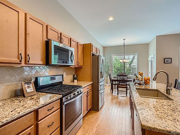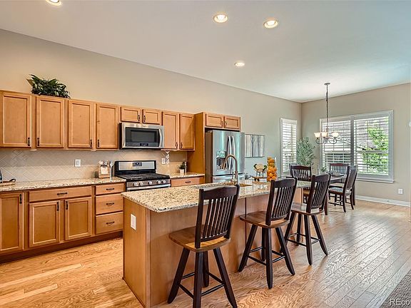 Welcome to vibrant 55+ living at its finest in the highly sought-after Anthem Ranch community. This thoughtfully designed residence blends comfort, functionality, and stunning Front Range views into a lifestyle you'll love coming home to. Step inside to discover upgraded plantation shutters, rich hardwood floors, and a bright, open floor plan that’s ideal for both everyday living and entertaining. The versatile home office with French doors offers flexibility to serve as a formal dining room or creative space. The kitchen is a true standout, featuring a large island, upgraded stainless steel appliance package, full-slab granite countertops, enhanced roll-out lower cabinets, and a glossy subway tile backsplash in an eye-catching herringbone pattern—delivering a fresh, modern feel. A cozy kitchen nook opens directly to the partially covered Trex deck, perfect for relaxing while enjoying the morning sun. The fenced pet-friendly yard includes wrought iron detailing and low-maintenance artificial turf. Comfort extends into the guest accommodations with a full guest bath complete with tasteful tile surround. This home is designed for both everyday ease and elegant living. Beyond the home, residents enjoy access to Aspen Lodge — a 32,000 sq. ft. community center offering indoor and outdoor pools, a state-of-the-art fitness center, tennis and pickleball courts, meeting rooms, and event spaces ideal for summer concerts and gatherings. With more than 90 clubs, year-round classes, and access to over 48 miles of scenic trails, Anthem Ranch provides an active, engaged lifestyle tailored to your passions. Don't forget the views of Longs Peak from the covered front porch. All this, just minutes from Denver, Boulder, DIA, shopping, dining, and medical care. Whether you’re seeking a sense of community, connection, or convenience—this is where it all comes together.