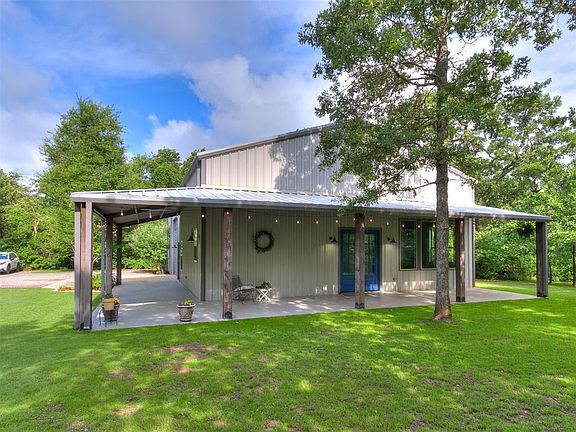 This modern, one-of-a-kind barndominium, nestled in a park-like setting on 2.06 acres, offers endless opportunities for indoor and outdoor living at its best. The interior hosts beamed, soaring ceilings, oversized windows, designer fixtures, and beautiful views. The heart of the home is a stunning living room with double entry doors leading to a 75-ft-wrap-around porch that serves as your private oasis for relaxation and entertainment. Its chef-inspired kitchen boasts elegant quartz countertops, custom cabinetry designed to maximize space and showcase the high ceilings, a walk-in pantry, and appliances including an electric convection stove and microwave. The primary bedroom is downstairs and features a spacious walk-in closet. The bathroom is complete with a cast iron tub, tile enclosure, and double sinks. Upstairs, you will find a versatile second living area (currently used as 3rd bedroom) and a second bedroom with a huge walk-in closet. The oversized 40x40 attached garage is fully insulated, features tandem 12x12 overhead doors, and is perfect for hobbies, storage, or a workshop. Built with efficiency in mind, this home boasts a variable speed condensing gas furnace with an AFUE up to 96.5%, a tankless water heater, and spray foam insulation for exceptional energy savings. A fenced garden area adds to the charm of this unique property.
