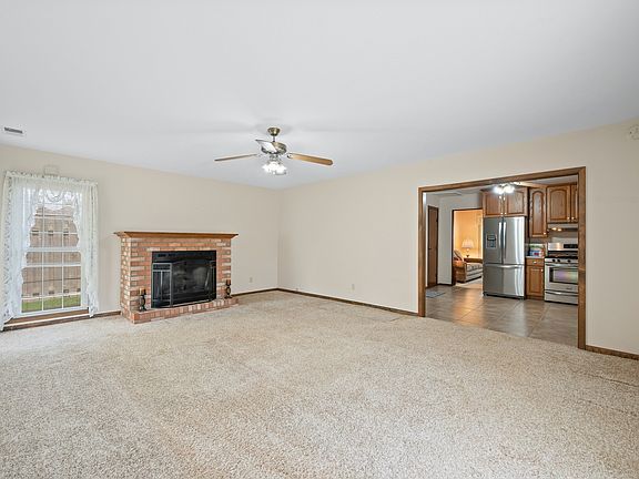 Generous family room with fireplace, flowing into an eat-in kitchen perfect for relaxing evenings or casual meals.