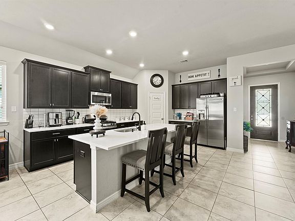 Discover your dream home in the award-winning Balmoral community! This home sits in a gated section, offering both security and peace of mind, just steps from the Crystal Clear Lagoon and amenity center - the heart of Balmoral living. From the moment you arrive, you’ll notice the spacious driveway, perfect for multiple vehicles and guests. Inside, the open layout blends comfort with entertainment. The living room features built-in speakers and a large projector screen ideal for movie nights, game days, or relaxing with loved ones. Out back, a brick fence adds privacy and durability, creating the perfect space for quiet evenings or weekend cookouts. Convenience is also at your doorstep — H-E-B, shopping, dining, and top-rated schools are just minutes away. Balmoral offers more than a home, it’s a lifestyle, with a gated entrance, resort-style lagoon, playgrounds, fitness center, and scenic walking trails. Don’t miss your chance to call this incredible property your new home!