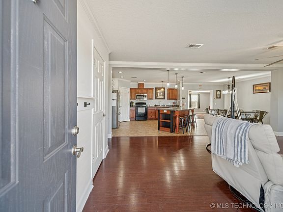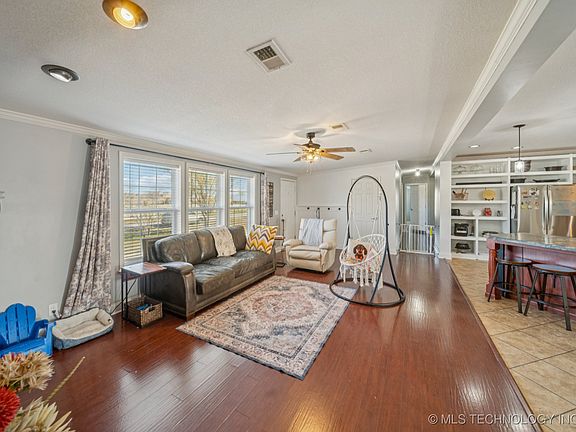 Outside, enjoy Oklahoma sunsets on the large back deck overlooking the above-ground pool — perfect for summer gatherings. Property also includes three outbuildings, one already equipped with electric and insulation, plus a storm shelter for peace of mind.