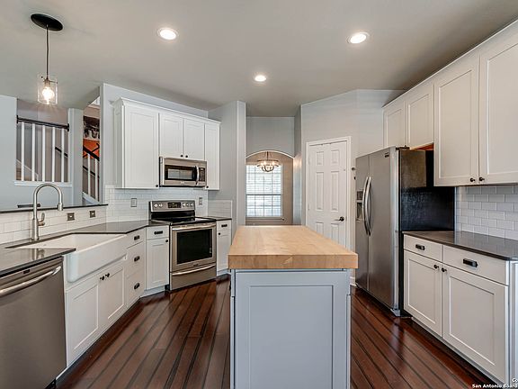 Located in a gated community near 1604, this beautiful home features bamboo flooring, abundant natural light, and a stunning modern farmhouse kitchen with white shaker cabinets, subway tile, and a butcher block island. Upstairs, the spacious primary suite offers a relaxing retreat with a garden tub, glass walk-in shower, and double vanity. Step outside to an oversized private backyard with swingset-perfect for play, entertaining, or unwinding under the stars. With stylish updates and a welcoming feel throughout, this home is ready for its next chapter!