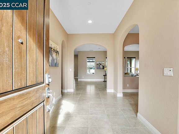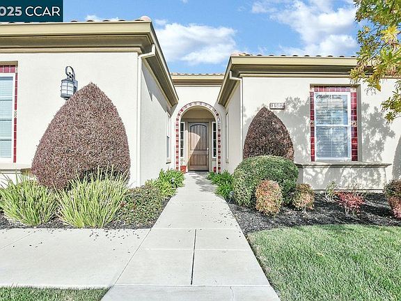Discover resort-style living in this exquisite 2-bedroom, 2.5-bathroom home with a den/office, nestled within a prestigious 55+ gated community. Built in 2013, this 2,651 sq ft residence features a 3-car garage and a prepaid 20-year solar lease for added convenience. The spacious kitchen is equipped with double ovens, granite countertops, and an abundance of cabinetry. The inviting great room and cozy hearth room with a fireplace provide ample space for relaxation and entertainment. The primary suite features a generous walk-in closet and a luxurious bathroom with a separate shower and tub, dual sinks, and a dedicated vanity area. An ensuite guest bedroom ensures comfort for visitors. The professionally landscaped backyard boasts two overhangs, expansive patios, a firepit seating area, and vibrant plantings, creating an ideal setting for outdoor gatherings. Residents enjoy access to a clubhouse with a café, event center, spa, fitness center, and courts for pickleball, tennis, and bocce. Embrace an active and vibrant lifestyle in this exceptional community.