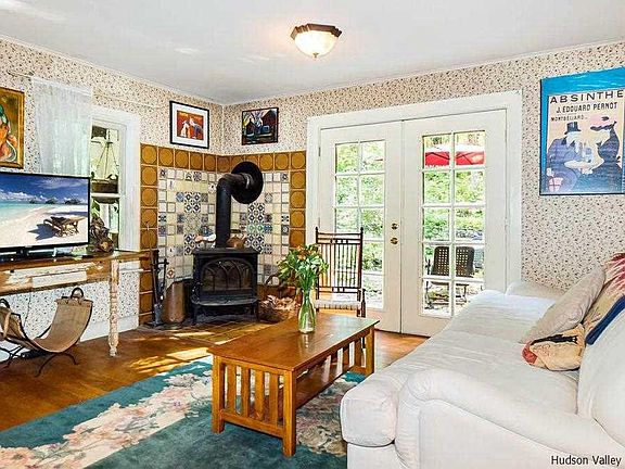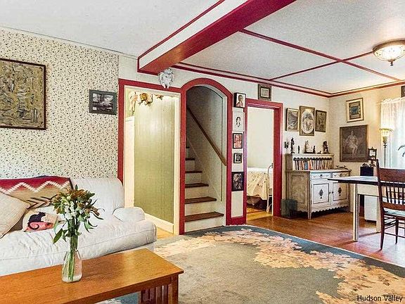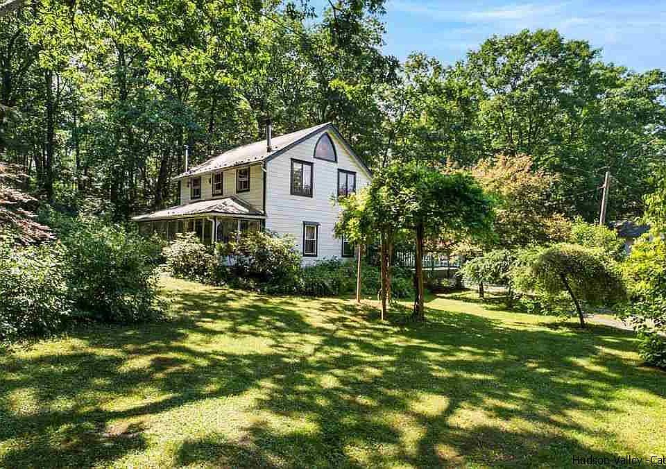 Welcome to Little Falls Farm! This property is a true haven for creatives located along the Kaaterskill Creek in the sought after hamlet of High Falls in Catskill. Only 10 minutes to either Saugerties or Catskill and 20 minutes to Kingston or Woodstock, enjoy nearly 8 acres of land, lower Greene County taxes, your own private swimming hole and 3 separate living units providing flexibility for Air B&B or long term rental income. The original 2 bedroom farmhouse from the 1800's oozes charm and character. A bedroom and bath, large living room, kitchen and rocking chair porch grace the first level and there is a primary suite with loads of light perched on the second story overlooking the landscaped grounds. A super charming one bedroom cottage is currently rented to a family member as a writer's retreat and features a lovely screened in porch overlooking a bluestone patio and gardens beyond. Amble your way through the grounds to the former barn/coop which has been converted into two successful one bedroom STR units with a laundry area between them, or you could rent them out together as a 2 bedroom stay. There are 36 fully owned solar panels on this building that provide power to the rental units and the main house for considerable utility cost savings. Heading down toward the creek is a delightful stroll past carefully curated plantings of fruit trees and ornamental perennials, stone sculptures and space for a large garden, greenhouse or pool if desired. Small scale farming is an option here. Round the bend under the archway to a very magical creekside paradise. The rushing water is so compelling you and your guests will not want to leave. There is a one room cabin plus an incredible enclosed treehouse overlooking the creek from above. Many happy memories to be made here lazing during the days and stargazing at night around the campfire. Private swimming holes are hard to come by and this one is truly mesmerizing. In addition to the house and associated buildings on almost 3 acres, there is a separate 5 acre lot (out of sight from the house) with its own entrance. There is a music studio here with electric but no water or septic. More possibilities for future use or simply to have and hold for privacy.