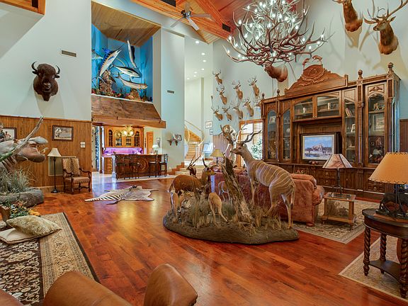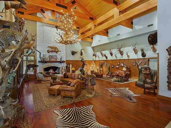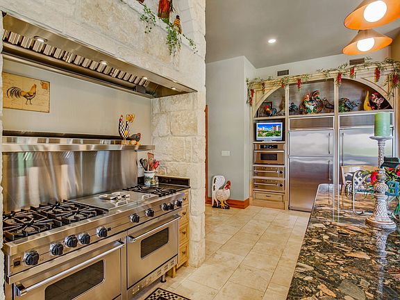 Texas Hill Country's Finest. W7 Ranch is centrally located off Highway 46 with easy access to Boerne, New Braunfels, San Antonio, and Austin. This impeccably manicured 141 +/- acre ranch backing to the Guadalupe River State Park is framed with majestic oaks and fabulous views. There is attention to detail starting with the gorgeous arched rock entrance and paved roads lined with native stone leading you all the way to the main residence. There you will find a beautiful rock home with every amenity a family and guests desire. The massive hand-carved doors welcome you to the light-filled entry leading to the impressive Safari/ living room with a massive limestone fireplace and soaring 32-foot ceilings. Unique artisan touches abound including a hand-carved mantel and bar, custom entertainment center, and second-story aquarium. The climate-controlled wine cellar and tasting room are reminiscent of a wine cave in Italy. The commercial-grade gourmet kitchen features beautiful millwork and a sizable granite island with spacious serving and storage solutions. There is open, flowing space from the kitchen to the family room boasting a river rock fireplace and incredible views of the pool, lake, and hill country. The master suite boasts spectacular views, a spa-like bath, and a handsome study. Upstairs you will find a cozy sitting area surrounded by bedrooms with incredible long-range views and separate lofts. The ground floor is host to a fantastic game room with a full bar, amazing gym, movie theater, and plenty of room for pool and game tables. The outdoor living space surrounding a 3-acre lake is an entertainer's dream. There is a party pavilion complete with a floor-to-ceiling river rock fireplace, a full kitchen, two separate bathrooms, and a stage for your entertainment pleasure. The two lakeside fire pits near the BBQ gazebo are the perfect place to relax in the evenings and watch the game come to water. Definitely a sight to see elk, zebra, axis, and whitetail deer. The 55,000-gallon swimming pool comes with a spa, waterslide, and three waterfalls. Plenty of room for all to enjoy. This amazing ranch is surrounded by 8-foot game fencing and also features a three-bedroom guest house, foreman's cabin, multiple barns for every need, helicopter pad and hangar, and various horse, chicken, pig, and deer pens. For the car enthusiast, there is enough garage space for 17 cars. With too many amenities to mention, this incredible property is sure to meet the needs of the most discriminating buyer.