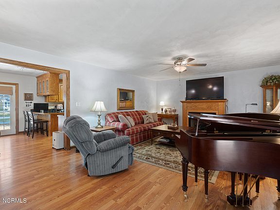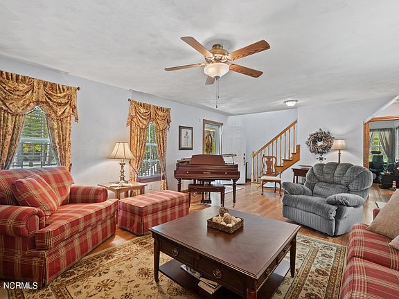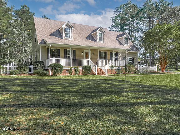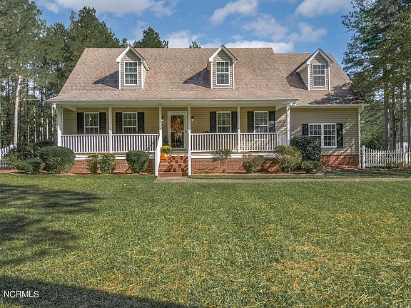 Welcome Home to this Craftsman's Haven that stands proudly on two manicured acres, a harmonious blend of nature and artistry. The exterior is maintenance free, and the roomy porches and covered carport lends a sense of timelessness. A welcoming front door invites visitors to step inside. As you walk along the blacktopped driveway the aroma of fresh pine fills the air as the breeze blows through the numerous pines throughout the property. The home's spacious porches provide ample shade, creating a cozy nook where rocking chairs and swings sit, perfect for sipping morning coffee while listening to the symphony of chirping birds. Inside, the Craftsman influence is palpable. Natural light illuminates the rich oak color of the LVT flooring and highlights the intricate woodwork that adorns the windows and door frames. The living room serves as the heart of the home, inviting family and friends to gather around the gas logs during chilly evenings. Adjacent to the living room is a spacious dining room and kitchen, where an island offers additional workspace for preparing family meals. The gleaming farmhouse sink overlooks a sprawling backyard, where you can enjoy porch or patio sitting, or just a few steps away, a cozy fire pit beckons for evening storytelling or marshmallow roasting under a star-studded sky. A hallway leads to the primary suite, a tranquil retreat featuring large windows that frame views of the surrounding grounds. A walk-in closet, and ample ensuite bath completes your private space. The Laundry Room, half bath and multi-purpose room completes the main level. On the 2nd level, you will find two HUGE bedrooms, one with a separate sitting/exercise room or office, and a full bath. This Craftsman home is not just a sanctuary; it is a gateway to all of the adventure that country living offers. The home is also handicapped accessible. Located within easy commuting distance to military bases, you don't want to miss this beauty! Call TODAY!