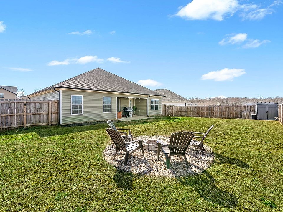 SELLER TO PROVIDE $5K IN CONCESSIONS! This beauty features vaulted ceilings, a shiplap fireplace, custom foyer paneling, and an open concept layout. The kitchen offers a large island, built-in bench, and a laundry room/pantry off to the side, boasting extra wood shelving and cabinets. The primary suite features double tray ceilings, a bright en suite bath with double vanities, and a huge walk-in closet! Two additional spacious bedrooms are nearby with a full bathroom in between. Enjoy a fenced backyard with a fire pit, covered patio, and small shed. Garage floor is epoxied! ASSUMABLE 5.75% VA LOAN!