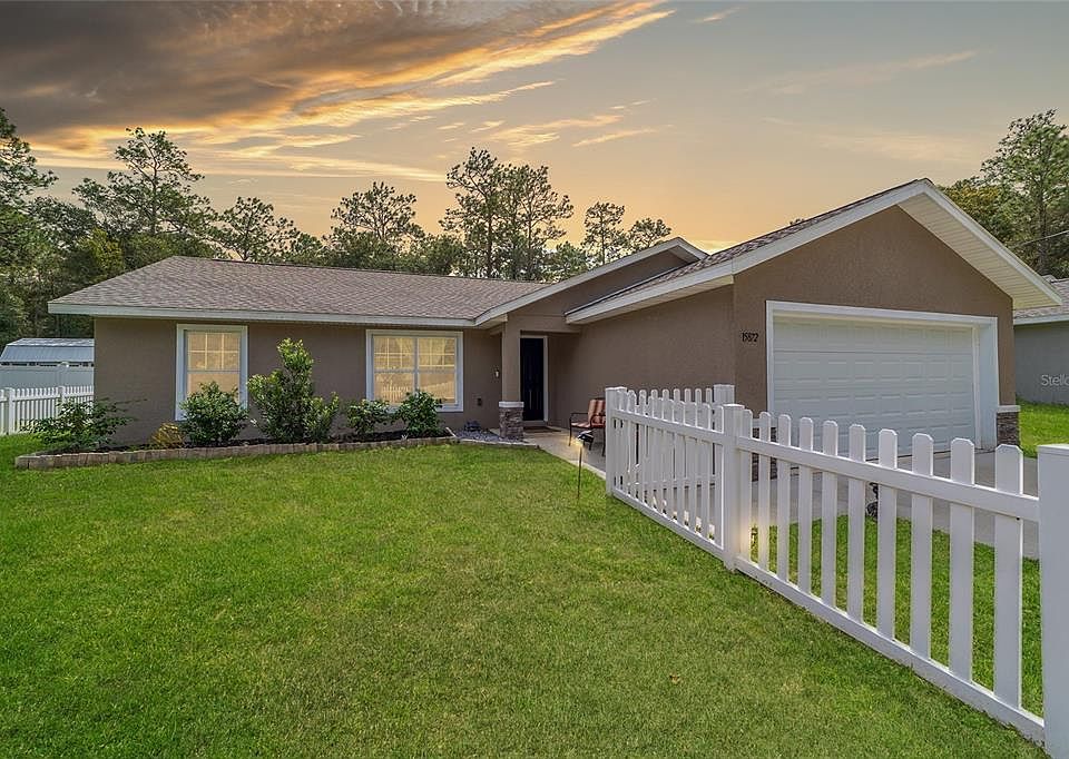 Why wait for new construction? Newly built in 2022, this versatile and open floor plan home features low-maintenance luxury vinyl plank flooring in the main living areas, high ceilings, great natural lighting, and an eye-pleasing neutral color palette. The nicely equipped kitchen features shaker-style cabinetry, a stainless appliance package, casual bar-height seating on the oversized island, plenty of prep and storage space, and a pantry for your extra storage needs. The kitchen is open to the living room and dining area with sliders to a recently added large, screened Florida room providing desirable outdoor living space to relax and enjoy time with family and friends. Entering into the master bedroom you will love the spacious walk-in closet and an ensuite bath with a large vanity and step-in shower with tile surround. A large vinyl privacy fenced backyard, 119-gallon well water tank with a whole home water filtration/softener system, two good-sized guest rooms, an inside laundry room, and a two-car garage are just a few more things you will love about this home. As an added bonus, this home is also conveniently located between Ocala and Dunnellon offering close access to the World Equestrian Center and the spring-fed Rainbow River with kayaking, canoeing, swimming, and tubing.