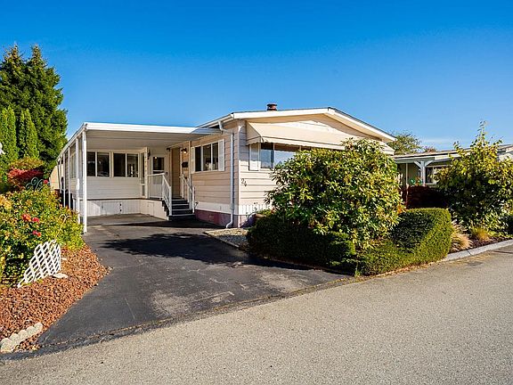 SEA RIDGE BAYS! Lovely double wide manufactured home on its own land. This home offers two bedrooms, two bathrooms and den/family room, plus addition of solarium and storage room. Large open plan living and dining room with vaulted ceilings and gas fire insert. Bright kitchen with skylights and greenhouse window, lots of cupboards, large counters, breakfast nook, pantry and storage. Primary bedroom with generous ensuite. Beautiful park setting. Age 55+. Council Approval Required Central location at King Georgie Corridor, close to shopping districts & White Rock Beach. (Please note some rooms have been virtually staged).