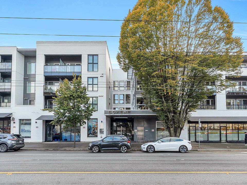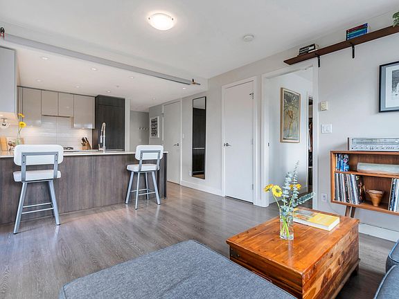 Bright & modern 1 bed + den + flex in the sought-after Bohème. This quiet upper-level corner home features a sunny south-facing balcony overlooking the lush courtyard, perfect for morning coffee. Open-concept layout with kitchen featuring Blomberg s/s appliances, gas cooktop, quartz counters & breakfast bar. Work from home in the dedicated office/den. Walk-in closet, large flex/storage room. 1 parking & locker included. Enjoy the gym, party room, playgound, rooftop patio & bike room. Just steps to grocery stores, transit, breweries, parks & vibrant Commercial Drive. The ideal urban lifestyle and pet friendly! OPEN HOUSE SUNDAY NOV 2ND 2-4PM.