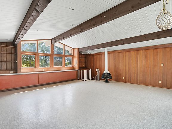 Central fireplaceRare sense of privacyFlexible upper spaceVaulted ceilingsExpansive window wallsCaptures panoramic viewsStriking mid-century modern residence