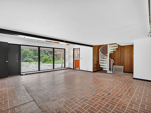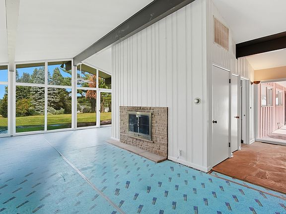 FIXER UPPER MID-CENTURY MODERN PROPERTY~FOUR PARCELS INCLUDED -Step into timeless design with this striking mid-century modern residence, set high on a 6.36-acre wooded estate. Perched on a scenic hilltop, the home captures panoramic views and a rare sense of privacy. Offering 3,030 sq. ft. of living space, expansive window walls invite natural light inside and blur the boundaries between the house and its serene surroundings. Inside, vaulted ceilings, exposed beams, and a central fireplace create a dramatic yet welcoming atmosphere. A balcony enhances the airy design, while a historic bomb shelter adds an unexpected piece of architectural history. The main level features three serene bedrooms, and the two-story addition offers a flexible upper space—ideal for a guest suite, creative studio, or private library. Practical touches abound with a breezeway mudroom, laundry area, small basement, and a formal dining room complete with built-in buffet. Outdoor living takes center stage with expansive brick and flagstone patios, covered porches, all set amid the trees. Garage space is generous with both an attached 2-car and a detached 1 car option. Originally built in 1955, this home represents a rare opportunity to own a distinctive property that blends mid-century style, modern updates, and unforgettable setting.