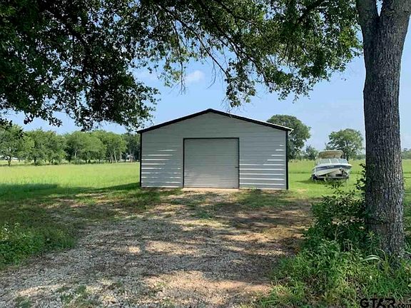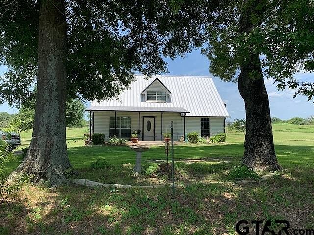Cute farmhouse style, white metal house with black shutters on 5 lush acres with shop and small storage building in quiet, rural location. Easy access to Lake Tawakoni or Lake Fork. Metal construction with stained and stamped concrete floors. 2 bedrooms, 1 bath, PLUS a large loft upstairs with a balcony overlooking the property. Vaulted ceiling in living room and kitchen; Wood burning stove; Kitchen has custom cabinets with breakfast bar-island for seating; utility room large enough for freezer as well as washer and dryer. 960 sq. ft. Shop with electricity and a roll up door on each end. Good road frontage on two county roads - CR 1307 and CR 1315. Fenced on three sides.
