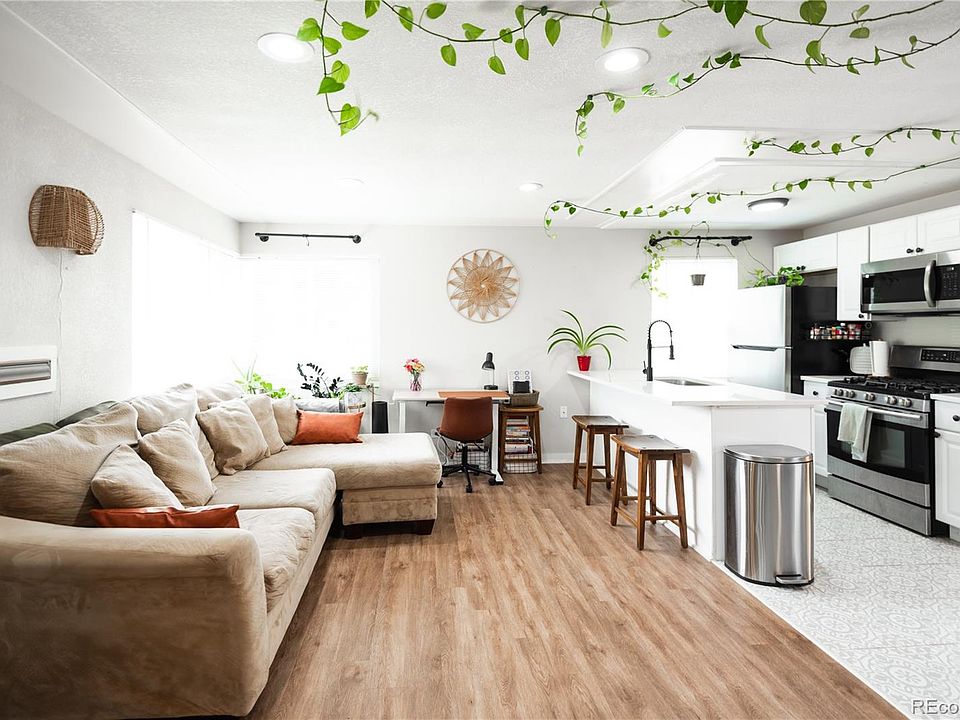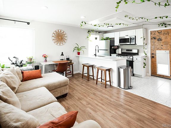 Welcome home to this beautifully remodeled Denver townhouse, ideally located just minutes from Lowry and the Stanley Marketplace! Step inside to an open-concept floor plan featuring newer luxury vinyl flooring and a spacious living area perfect for relaxing or entertaining. The dining area offers plenty of room for a large table, while the stunning kitchen boasts newer white cabinetry, quartz countertops, and a peninsula island with seating—ideal for casual meals or morning coffee. The bedroom features newer carpet and is conveniently located near the in-unit laundry area. The full bathroom has been tastefully updated with custom tile work and a modern vanity. Enjoy a generous private backyard—perfect for pets, gardening, or weekend BBQs. Additional highlights include a newer A/C unit, roof, furnace, electrical panel, and updated windows for year-round comfort and energy efficiency. All you need to do is move in!
