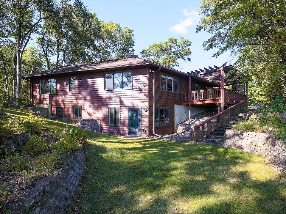 This beautiful 3-BR, 3-BA home offers stunning southerern exposure and an impressive 208 feet of frontage on Red Sand Lake. The main floor features hardwood flooring throughout, a spacious living room with a brick gas burning fireplace, and a well-appointed kitchen equipped with stainless steel appliances, granite countertops, and custom cabinetry. The dining room provides access to a deck perfect for outdoor entertaining. The primary suite includes a walk-in shower, while an additional bedroom and full bath complete this level. The lower level boasts a cozy sitting room, a walk-out family room, another bedroom, bathroom and an office that could easily serve as an extra bedroom with the installation of an egress window. Additional amenities include a laundry room with extra kitchen space and various storage options. Outside, you'll find an additional garage featuring a heated and insulated workshop alongside fruit trees and breathtaking views throughout the 1.6 acre property located in the heart of the Brainerd Lakes Area.