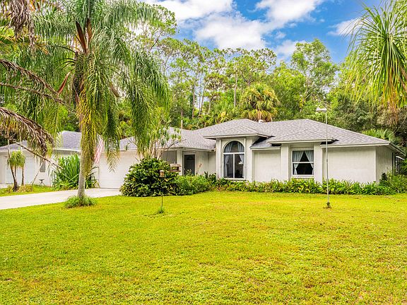 Welcome home to serenity! This turn-key home is resting on a 10 acre lot, featuring 3 bedrooms, 2 full baths, 2 car garage, 1,040 sqft detached CBS garage with two 9 ft garage entry doors in front and back. As you enter the lengthy driveway you are greeted by mature oaks and palms trees, a large pond with lots of fish, bringing you to this beautiful home with soaring high ceilings, a split floor plan, spacious open living areas offering an abundance of natural light with tiled floors throughout. The kitchen is bright with white cabinetry and grey countertops, modern stainless steel appliances, double door refrigerator with water and ice maker, large pantry and eat-in counter, a large window that opens to the spacious terrace overlooking the saltwater heated pool and greenery perfect for entertaining. Gorgeous primary suite featuring tiled floors, large walk-in closet, spectacular en suite bathroom with vanity, shower and soaking bath tub. Two spacious bedrooms with large walk-in closets, a cabana bathroom with access to and from the pool area. The home comes with accordion shutters and aluminum shutters. The screened covered patio brings you to a fenced backyard, property has 2 fire hydrants, peroxide water system, county water is available, A/C replaced 2020, water heater replaced 2022, and brand new roof 2025. This gem is tucked away in a superb quiet equestrian location of Loxahatchee Groves right off of Okeechobee Blvd and A Road with equestrian trails, shopping, fine dining, recreational parks, Lion Country Safari and Wellington's World Class National Polo Center, golf courses, beaches and much more just minutes away! Come see why Loxahatchee Groves is highly sought after and take in the fresh country air and peaceful sounds of nature. John Deere 4300 Diesel tractor with many attachments and hot tub are included. No HOA fees, high and dry corner lot and paved roads! Bring your toys, trailers, pets, horses, build stalls, an arena the possibilities are endless!!!