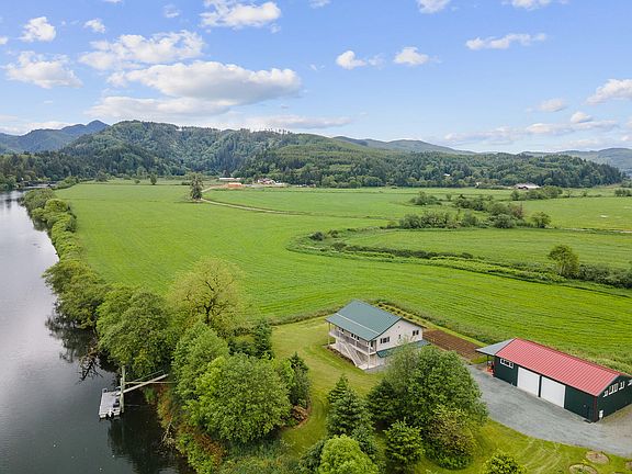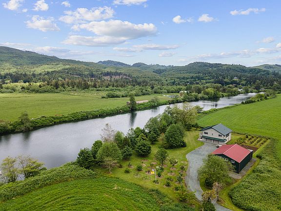 Pretty Close to Paradise! Just under 2 level riverfront acres, surrounded by pasture, accessed by private road, this multiple bdrm/bath estate is immaculately landscaped w/vegetable garden, mature berry bushes & fruit trees. Gated, very private, with a magnificent mountain view. Aluminum pontoon boat dock w/60 HP motor, metal gangway, plus a fish-cleaning station. 2360 sqft metal shop building w/ ADU,13' doors & opener stores boats, RV's, all your big-boy toys. AND the house is luxe--hardwood floors, heated bathroom floor, metal roof, heat pump, quartz counters, two master suites, all opening onto an expansive deck overlooking the river. Ground level of home all garage. Xtra covered exterior storage. Fish, kayak, paddleboard, or just relax on 1 of 2 decks with your favorite beverage.