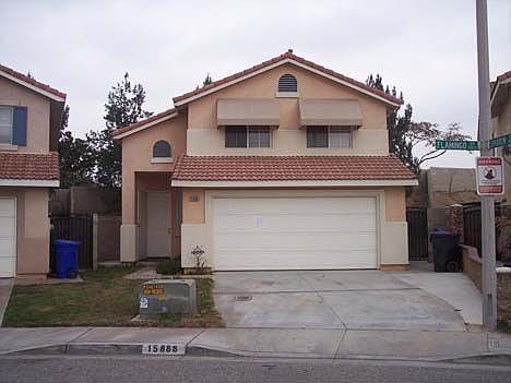 Lovely 3 Bedroom / 2.5 Bath two story home located the desirable community of South Ridge in Fontana. This home is commuter friendly located between the 10 FRWY, 60 FRWY and public transportation. The first floor layout is a wide open floor plan, with high ceilings, newly tiled floor with decorative design, nice cabinets in good condition, nice kitchen island with bright clean tiled counter tops, large pantry, HUGE dining area, indoor laundry hook ups, bathroom down stairs, dual pane sliding door that opens to the lovely back yard with view of local hills and, grass lawn, fruit trees, concrete patios and plenty of space for the family get togethers. Make your way upstairs on the new laminate flooring staircase, the laminate wood flooring spreads into the hallway and bedrooms. The 3 Bedrooms include a HUGE master bedroom with walk in closet and spacious master bathroom with tub, with two additional bedrooms across the hall that overlooks the living room. Other amenities included are Tiled Roof, Front window awnings, aluminum garage door, storage shed, security front door, central A/C, Central heat, ceiling fans, sprinklers, two car driveway, exterior lighting and much, much more. Hurry this one will not last!