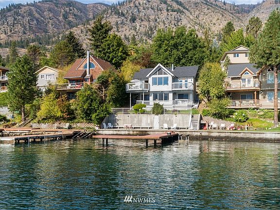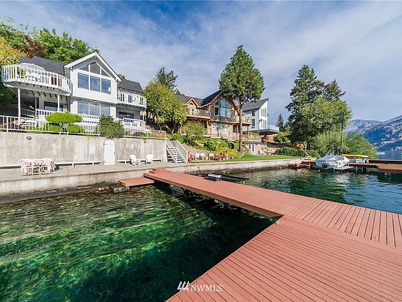 Charming waterfront home with extra large waterfront entertainment patio. 50' of bulkhead and step-in access to the lake. Coveted 525 sq ft L shaped dock with boat lift. This immaculate home has been very well maintained including new roof, carpet, blinds, fresh exterior paint and professional landscaping. Pine cathedral ceilings throughout all of the main floor. This home has amazing lake and mountain views from every room. Life is better on the Lake!