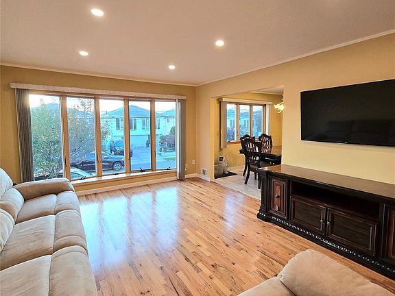 Inside, the home is bright and spacious, featuring 36 custom recessed LED lights with dimmer switches and thoughtfully placed outlets designed for floating TVs. The upper level offers a warm and inviting layout with a skylit eat-in kitchen, a large living room with a picture window, and a formal dining area. The newly sanded hardwood floors run throughout the living room, hallway, stairs, and three of the bedrooms, while the primary bedroom and lower-level bedrooms feature new luxury carpeting with high-end padding. The primary bedroom includes its own ensuite half bathroom, and the main upstairs bath has been beautifully renovated, showcasing a granite countertop, double sinks, and floor-to-ceiling tile.
