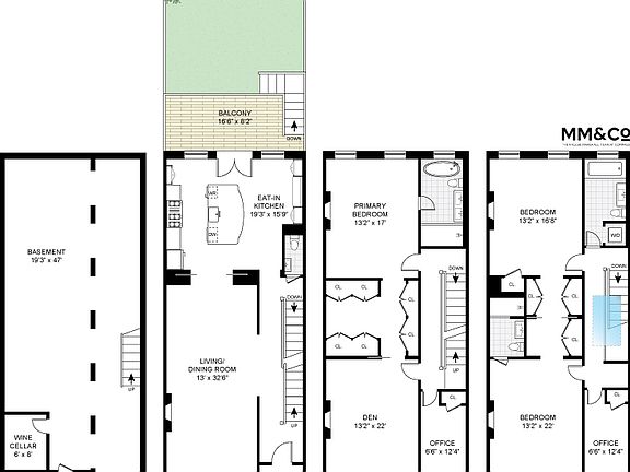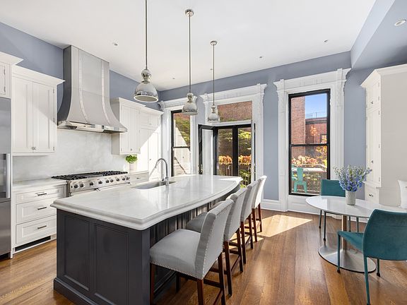 Enter on the parlor level to a grand open-concept living and dining area with soaring 11-foot ceilings and restored original millwork. The wide, open floor plan flows seamlessly into a custom chef's kitchen featuring bespoke cabinetry, a Viking range, Miele appliances, wine fridge, and an oversized center island perfect for entertaining. A wall of windows and French doors open to a generous terrace overlooking a lushly planted garden with irrigation and drip systemsideal for outdoor dining and relaxation.
