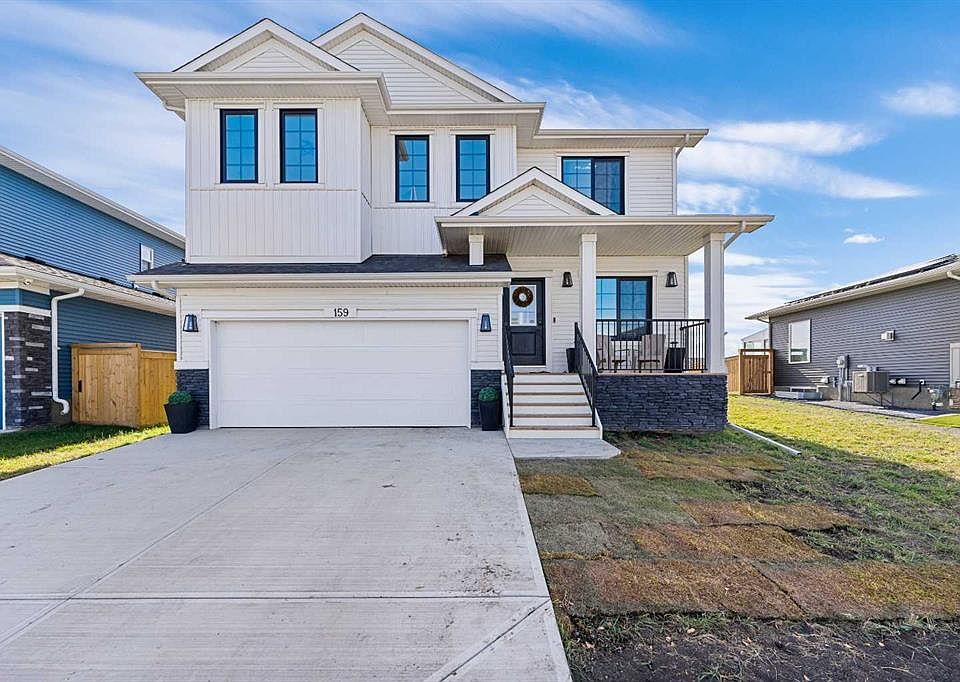 This gorgeous custom-built home stands out with designer finishes, over $150k in thoughtful upgrades, and a layout designed for both family living and entertaining. From the moment you step inside, you’ll notice the impeccable flow — soaring 20-foot ceilings in the main living area, expansive windows that flood the home with natural light, and timeless farmhouse-inspired exterior details with modern pops of style. The kitchen is a chef’s dream, designed as a true working kitchen with a walk-in pantry that can easily be converted into a butler’s pantry for extra convenience. Upstairs, the primary suite is smartly separated from the kids’ bedrooms for privacy, while a versatile bonus room makes the perfect playroom or media space. Downstairs, the basement is a blank canvas — boasting tall ceilings and large 3-foot egress windows, it feels open and bright, ready for your vision to come to life. Car enthusiasts will love the oversized double garage with soaring ceilings — perfect for adding a car lift and transforming it into a four-car garage. The lot also offers flexibility, with the potential for RV parking since there’s no triple-car garage encroaching on the yard. The south-facing backyard adds even more appeal, offering sunny outdoor living space. Location is everything, and Langdon delivers the best of both worlds: small-town charm with exciting amenities on the way, including a new strip mall and McDonald’s, while schools and local conveniences are just a short walk away. Plus, the drive into Calgary is similar to commuting from South Calgary — giving you more home and more lifestyle without the city hustle and additional cost. If you’re looking for a home that blends timeless design, incredible functionality, and unbeatable value in a growing community, 159 Brander Ave is the one.