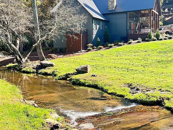 NEW CONSTRUCTION (FINISHED IN 7-10 DAYS NEW PICS THIS WEEK), MOUNTAIN VIEW, +-200 STREAM FRONT, 28' WALL OF GLASS overlooking sunset mountain views, framed by ponds, pastures and the rushing waters of Pine Creek. Nestled on a 1.5 +-acre FLAT grassed lot with 200+- feet of frontage on a crystal-clear trout stream. 40' from the streams edge and 3 MINUTES FROM LAKE GLENVILLE. Listen to the shoals from everywhere in/around the home. 3400+- SF finished on two levels. TWO Primary bedrooms on the main with vaulted/Beamed ceilings and private decks overlooking the stream. Each has an incredible oversized shower with rain head and a soaking tub. Gorgeous stone firepit right at the streams edge next to the incredible shoals. Home to native brook trout, where bald eagles soar and fish the stream and Cherokee Nation arrowheads are found along the banks. 20 minutes to the crossroads of Cashiers along the gorgeous shores of the lake. Finishing touches (Final staining/paint, fixtures etc....) will be completed in the next 7-10 days. This is the last home in a Private enclave of 4 NEW Telluride inspired Mountain homes.