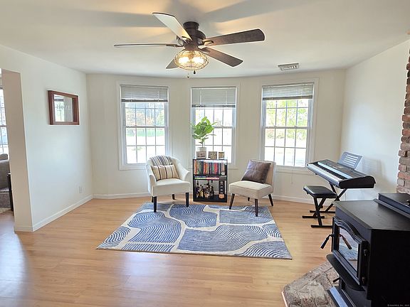 Welcome Home to this well-maintained and charming Colonial offering timeless style surrounded by scenic tobacco field views. Before entering, enjoy the picturesque enclosed front porch-perfect for your morning coffee or relaxing evening retreat. Inside, you'll find gleaming hardwood floors and abundant natural sunlight throughout the spacious living room-an inviting space for gatherings with family and friends. The thoughtfully designed floor plan leads to a generous eat-in kitchen featuring stainless steel appliances, granite countertops, and ample cabinet space. A versatile family room provides the ideal spot for entertaining, a home office, or a play area. Upstairs, you'll find three bright bedrooms and beautifully updated bathrooms. Additional highlights include newer central air, vinyl siding, gourmet kitchen, a smart thermostat, and a keypad entry lock for added convenience. The unfinished basement and detached 2-car garage offer plenty of storage, plus an RV parking pad for extra flexibility. Set on a large, level, and cleared 0.52-acre corner lot, this home provides privacy, open space, and room to play-surrounded by farmland yet close to everything! Enjoy nearby Ellington Trails, Enfield shopping, and quick access to I-91. Schedule you private showing today!