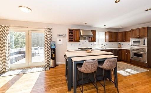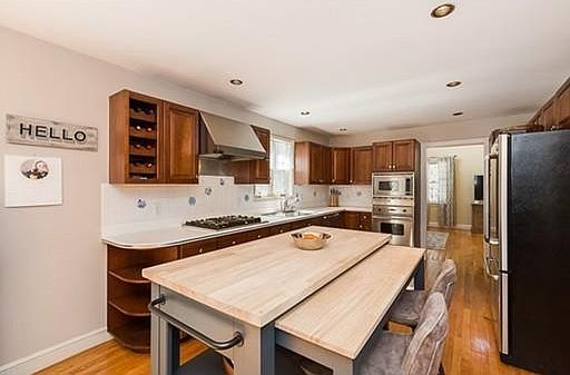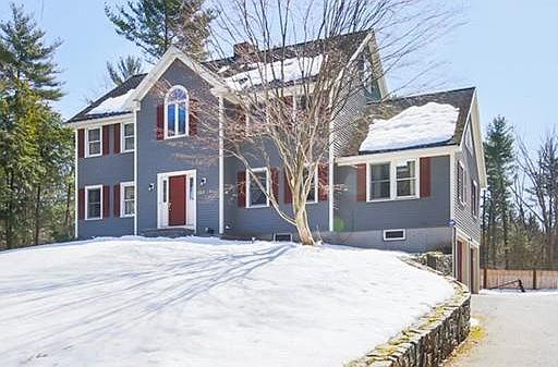 Tons of space inside & out in this 4 bed, 3.5 bath home on an acre of land in Rowley. A two-story foyer with gleaming hardwoods welcomes you into the home. Dining room with chair rail detail & spacious living room w/bay window flow right off the foyer. The kitchen boasts stainless steel appliances, including a Viking range, gas stove, glass front cabinets & built-in wine rack. From the kitchen step through a french door onto a large, new deck, great for warm weather entertaining and living. The family room features soaring cathedral ceilings, skylights & wood burning fireplace. Laundry & 1/2 bath complete the 1st floor. Upstairs has generous master bedroom with walk-in closet & ensuite bath with double sinks, jetted tub, skylight & separate shower. Two additional, good-sized bedrooms & full bath on this level. The 3rd floor has another bedroom & addt'l space for office or play area. Finished basement with bath, new high-efficiency heating system, 2 car garage & huge fenced back yard.