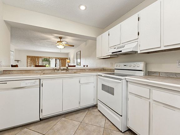 Peaceful green spaceIn-unit laundryNeutral tile flooringSpacious screened-in patioWhite appliancesWhite cabinetsBright and functional kitchen