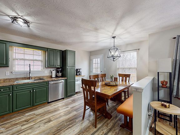 Upon entry, there's a coat closet, access to the first floor laundry room/mud room (that leads to the attached garage), and luxury vinyl plank flooring added by the current owners. A coat of neutral painted walls makes the open floor plan feel even more spacious. The green cabinetry in the eat-in kitchen and modern light fixtures bring the style to life. The eat-in kitchen also has matching stainless steel appliances, over-the-sink kitchenware hooks (for hanging pots/pans as desired), and the sink has been upgraded to a deep, single, stainless steel basin with a pull-down faucet.