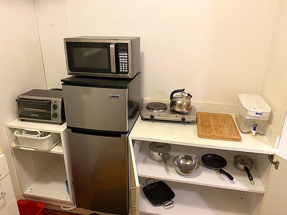 NOTE: as tenant you will have only limited access to the main kitchen downstairs. So if you're into cooking, this is not the place for you. There is a Brita reservoir and dish rack, but no sink. You can wash dishes downstairs or in the bathroom sink.