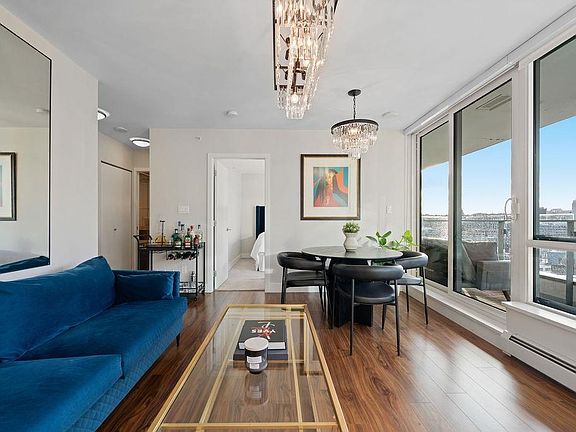 Rarely available high-floor home with a unique wide layout and a full wall of windows spanning the bedroom, living area, and kitchen, creating an open and airy feel. Located in renowned Tower Green in Olympic Village, this bright floorplan features elegant finishings and thoughtful owner upgrades throughout. The large bathroom includes a long countertop, double sinks, and a separate bath and shower. Enjoy a spacious balcony with wood tile, full-size washer and dryer, and a flex room ideal for a home office. Exceptional amenities include a large gym, meeting room, rooftop patio, media room, and clubhouse. One full-size parking stall with EV plug and storage (6x4x7) included. Steps to the seawall and SkyTrain for the best of Vancouver living. 2 dogs or 2 cats allowed.