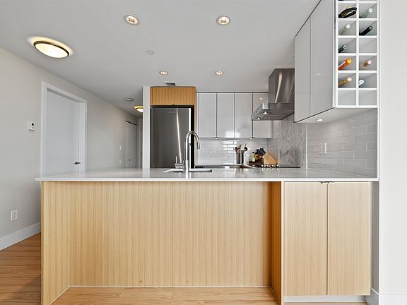 Fantastic 2 bedroom, 2 bathroom, open concept living awaits in the heart of Olympic Village! Welcome to the Tower Green building. You'll love this bright, south-facing unit, city & mountain views, with large living and dining rooms, and kitchen complete with quartz counters and stainless steel appliances. Great layout with large bedrooms located on opposite sides of the unit, ideal for privacy. A bonus is the den/pantry/storage space. Custom shelving, drawers and storage added in all bedrooms and den. Enjoy morning coffee on your covered balcony and short walks to all the great amenities: groceries, restaurants/coffee shops, seawall, sky train, Canada line, bus 84 right out front(direct to UBC) and more! 2 pets allowed, rentals allowed (no short term). 1 parking. Book your showing today!