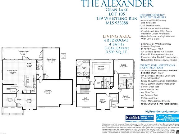 New 100% Energy Certified Providence Home! The Alexander features 3,509 SqFt. of living space with 4 bedrooms, 4 baths, Study, Formal Dining, Gourmet Kitchen with granite counters, First floor game room with full bath. Second floor with 4 bedrooms, 3 baths and Loft. Extended covered patio. Tile flooring throughout except for bedrooms. 3 car garage. MOVE IN READY!