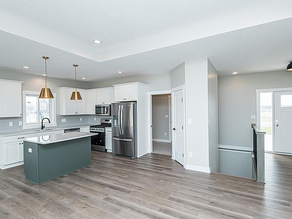 This four bedroom, three bath home with over 2,500 total square feet has an open concept main floor and features a large kitchen island, gas fireplace, entry mudroom and main floor laundry. The primary bedroom features an oversized walk-in closet and primary bath with tiled shower and dual vanity sink. Lower level features a walk-out basement, large family room and 2 additional bedrooms. This spacious lot has a large concrete patio at the walkout basement as well as a well landscaped retaining wall. Schedule your showing today for this unique and modern floor plan!