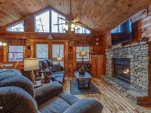 OVER $43K GROSS INCOME IN 2024! Superior rental performance is just one of the perks of this cozy log cabin in Hidden Mountain West. The great room has a wall of windows for the wooded setting and a stack-stone fireplace for warmth, with a cathedral ceiling overhead and wood floors underfoot. The kitchen features sleek black appliances and a breakfast bar, while the dining area has a door leading to the screened porch with hot tub. The king bedroom has a 3-sided peninsula fireplace that separates the bed from the whirlpool bath set in a stone alcove. The adjoining bath features a custom tile shower, plus there's a laundry closet with stack washer/dryer. Outside there plenty of options including an open deck and a covered front porch in addition to the screened porch. The owners have been very proactive about maintenance and updates, so the cabin is in tip-top shape for continued rental success. Located just 10 minutes from the Parkway and with easy access to all our area has to offer, ''The Highlands'' was booked 249 nights in 2024 and has an ''Exceptional'' 9.6 rating on VRBO! Request a private showing soon, as a property with this income ratio is sure to sell soon!