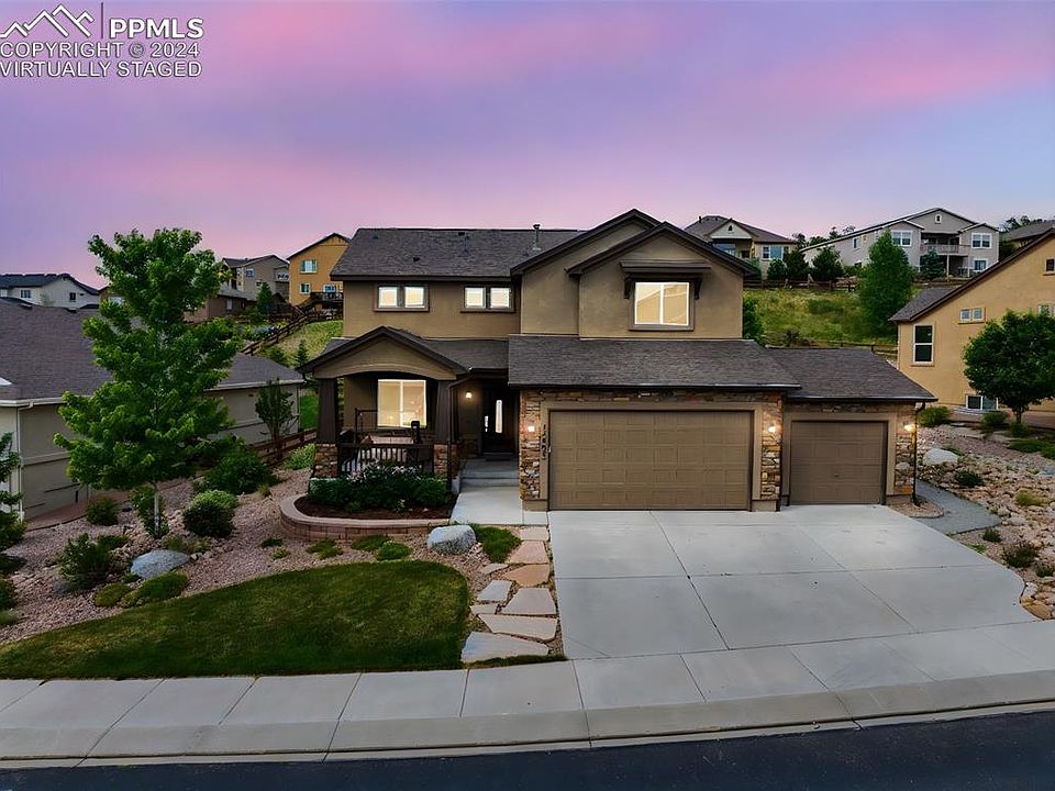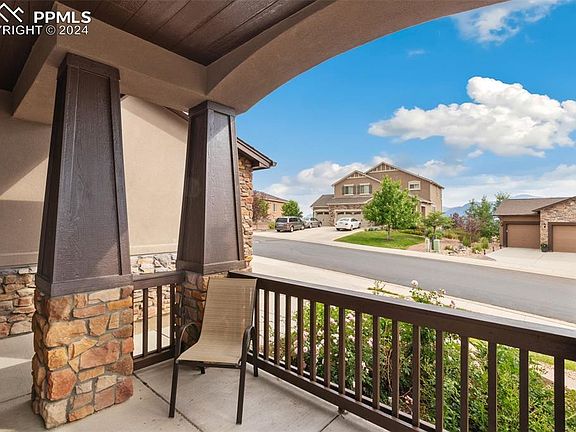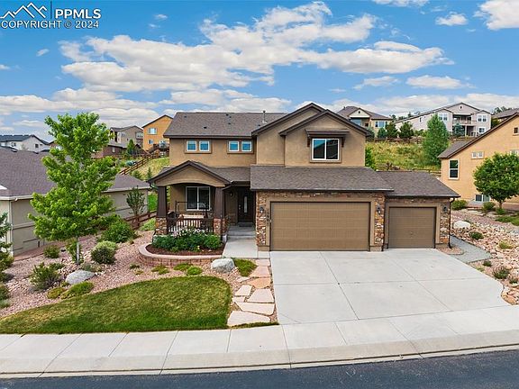 A new roof is scheduled to be installed!! Perfectly situated on a generous 15,751 square foot lot, this home offers a serene retreat from the hustle and bustle of everyday life. Nestled in the Promontory Pointe neighborhood on a quiet cul-de-sac, you will find this 5-bedroom, 4-bathroom home loaded with updates! The open-concept design brings the kitchen, dining, and living room areas together creating the heart of the home. The kitchen has newly installed granite countertops, a newly installed backsplash, a new stainless steel GE refrigerator, and a gas cooktop as well as a newer BOSCH dishwasher. The main level study is right off the entryway with French-style doors. The main level is complete with new carpet, refinished hardwood floors, and new paint. Upstairs you will find the primary suite which offers not only one but two walk-in closets, tray ceilings, and a bathroom. Additional comforts on the upstairs level include a full bath, linen closet, and two additional large bedrooms. The laundry room is conveniently located on the upper level and has mountain views from the window. The newly painted basement is complete with a cozy living room, two bedrooms, and a full bath, offering flexibility and convenience for guests or additional family members. Sit on the covered front porch and relax while enjoying views of Pikes Peak and Front Range Mountains over the beautifully landscaped yard. Entertaining is a delight on the back patio with ample room for patio seating, grills, and a gas fire pit. The backyard is an oasis with stunning mountain views of Pikes Peak from the top and two raised garden beds ready for planting. Sledding down your own sledding hill will be perfect for winter family fun. Completing this home is a three-car garage with a new garage door and beautifully landscaped grounds. Promontory Pointe offers elevated mountain views, walking trails, and a fun park. Monument offers top-rated schools and easy access to I-25 and the AFA.