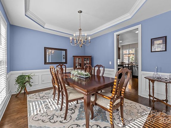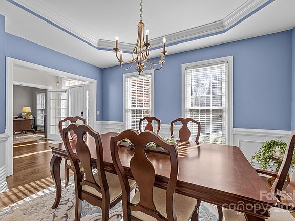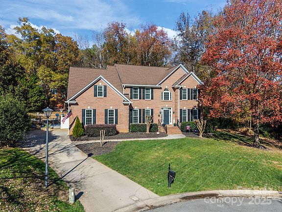 Stunning all-brick, five-bedroom home located on an oversized cul-de-sac lot in the highly desirable Ballantyne area. This prime location offers convenient access to shops, restaurants, and I-485. This spacious home features an open floor plan with elegant hardwood floors throughout the main living areas, including a dramatic two-story great room with abundant natural light from its skylights. The main-level primary ensuite offers a luxurious retreat with a jetted tub. A versatile fifth bedroom, which can also serve as a bonus room, boasts a large closet, flexible usage options, and a private staircase leading up from the main level. Outdoor living and entertaining are made easy with a beautiful pebble-tec in-ground pool and hot tub, complete with a soothing waterfall feature, alongside a spacious deck. The mature landscaping provides exceptional privacy and charm, enhancing this outdoor oasis. Additional highlights include a covered porch, an oversized garage with built-in shelving, a dedicated storage outbuilding, and a gas line ready for stove conversion. With a low HOA and exceptional curb appeal, the meticulously maintained yard and inviting exterior truly make this home a standout.