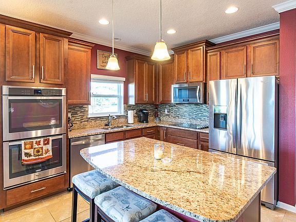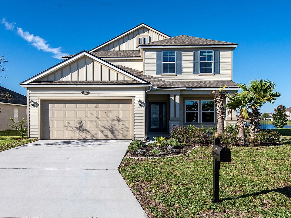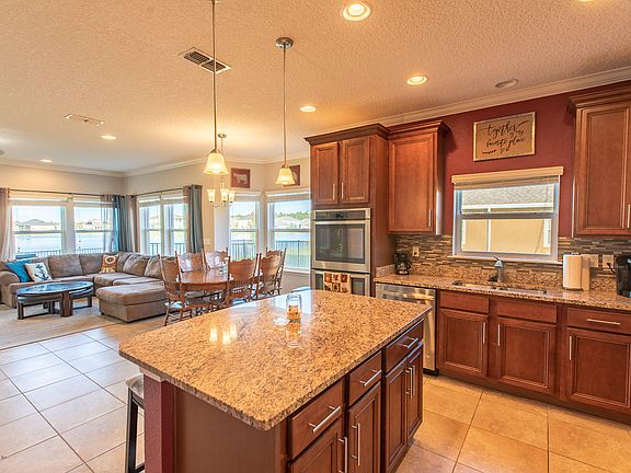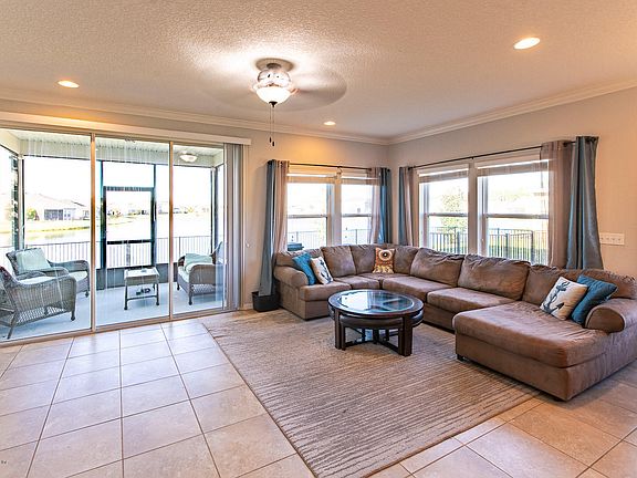 This home features a water view, gourmet kitchen with double ovens, stainless steel appliances, granite counter-tops, bay window, recess lights, downstairs owner suite, ceramic tile floors, architectural shingle, screened lanai, and much more. Exclusive amenities featuring a resort-style pool, kid's splash park with slides & fountains, fitness center, lighted tennis courts, basketball courts, soccer field, sand volleyball court, clubhouse with kitchen, expansive covered porch and fireplace.