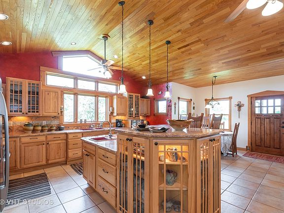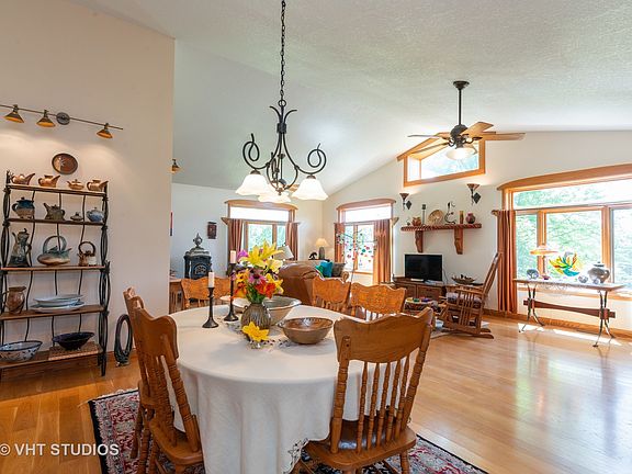 Peace and quiet await you in Franklin Grove. This 3 BR 2 BA custom home was built in 2002 on 10 acres of gorgeous land, just an hour and a half from Chicago. The property is very close to an Equestrian park/trails, and the Franklin Creek State Natural Area. From the moment you enter through the custom hand-carved front door, you'll be impressed with the design and attention to detail throughout this stunning home. The open concept pulls your eye through the entry to the wide open living room, accented by vaulted ceilings. Windows in every direction bring in natural light and provide amazing views. The living room spills into a formal dining room. The kitchen is fit for a chef, and was designed with hosting in mind. The hickory cabinets are topped with granite counter tops. A waterfall style island provides room to entertain friends and family. SS appliances, including an elevated GE dishwasher, makes for easy use and an attractive look. Good sized bedrooms, including a master suite that will leave you breathless. Sprawling ranch layout with unfinished basement offering lots of possibilities. Brand new AC in main house. This property also offers an 1165 sq ft building with a HUGE attached over-sized garage big enough for an RV. This building has 220 amp electric service and has been used as an artist's studio. Could be used as additional living space - has a bathroom with shower and nice front porch. New sump pump and furnace in 2019. There is a dump station and RV hookup near this additional building. Your sanctuary awaits you! Call for your private showing today!