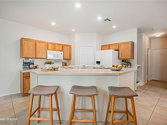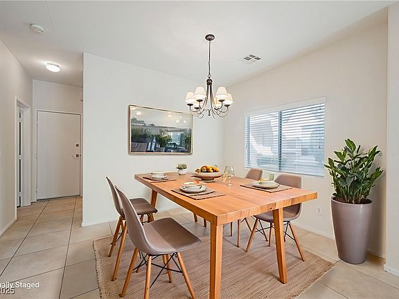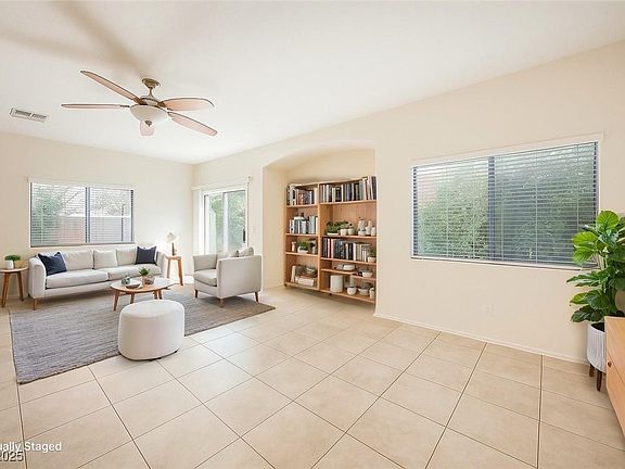 Charming 2-story townhome in gated Old Vegas Ranch! This 3 bed, 3 bath home offers 1,670 sq ft with tile flooring downstairs and comfy carpet upstairs. Spacious kitchen, large laundry room, and ceiling fans throughout add comfort and convenience. The primary suite features a walk-in closet and dual sinks in bathroom. Enjoy the well manicured landscaping and private backyard patio...perfect for relaxing or entertaining. Community perks include a pool, spa, park, playground, BBQ area, and skate park. With easy freeway access and just minutes from the River Mountain Bike Loop Trail, this home blends style, comfort, and location. Move-in ready!